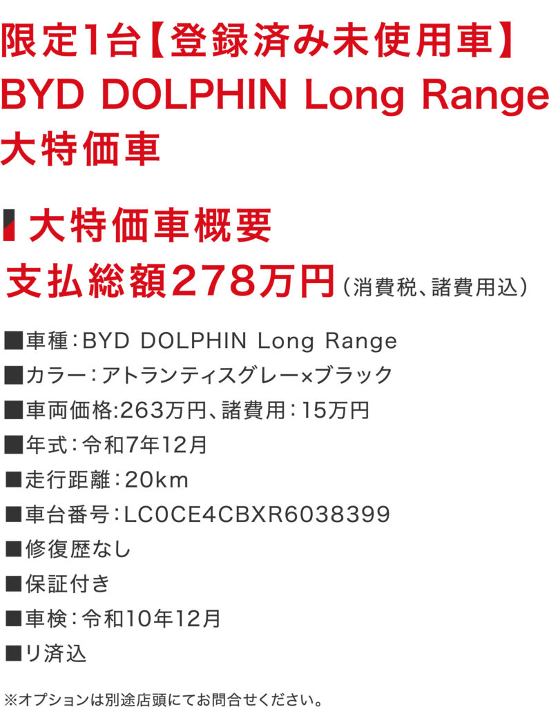 限定1台(登録済み未使用車)BYD DOLPHIN Long Range大特価車